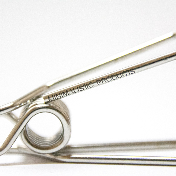 難易度の高いフォルムを実現するため、埼玉県のスプリングメーカーと共同で加工方法を開発しました。 高光沢の表面も、埼玉県の小さいながらも技術力のある加工メーカーで研磨を行っています。 ワイヤーはクリップに合わせたデザインになるよう大阪のメーカーの特注品です。 精密に表記されたロゴは日本製のレーザーマーカーを使用。細部までこだわって作った製品です。